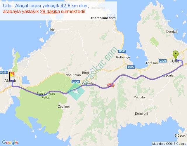 Urla - Alaçati arası yaklaşık olarak 90 km/h ile yukarıda belirtilen sürede olup, iki yerin kuş uçuşu uzaklığı (mesafesi) 34'dir. Yolculuk otobüsle 36 dakika sürmektedir.
