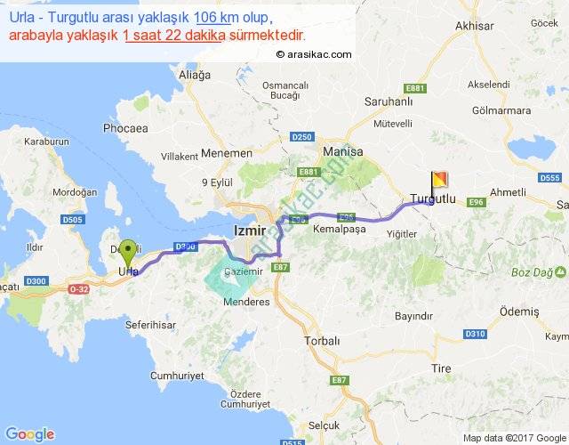 Urla - Turgutlu arası yaklaşık olarak 90 km/h ile yukarıda belirtilen sürede olup, iki yerin kuş uçuşu uzaklığı (mesafesi) 84'dir. Yolculuk otobüsle 1 saat 46 dakika sürmektedir.