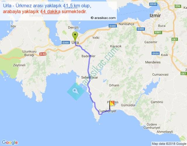 Urla - Ürkmez arası yaklaşık olarak 90 km/h ile yukarıda belirtilen sürede olup, iki yerin kuş uçuşu uzaklığı (mesafesi) 31'dir. Yolculuk otobüsle 57 dakika sürmektedir.