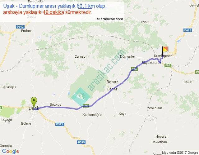 Uşak - Dumlupınar arası yaklaşık olarak 90 km/h ile yukarıda belirtilen sürede olup, iki yerin kuş uçuşu uzaklığı (mesafesi) 53'dir. Yolculuk otobüsle 1 saat 3 dakika sürmektedir.