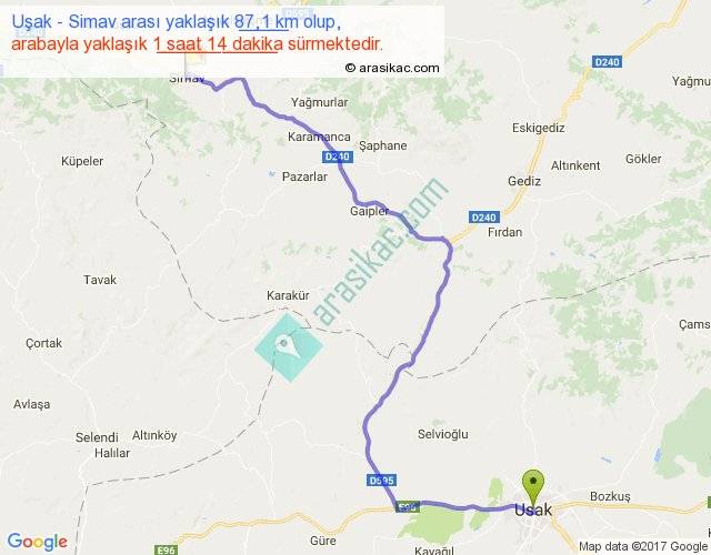Uşak - Simav arası yaklaşık olarak 90 km/h ile yukarıda belirtilen sürede olup, iki yerin kuş uçuşu uzaklığı (mesafesi) 59'dir. Yolculuk otobüsle 1 saat 36 dakika sürmektedir.