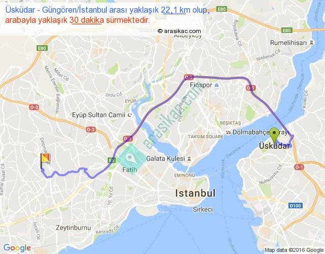 Üsküdar - Güngören İstanbul arası yaklaşık olarak 90 km/h ile yukarıda belirtilen sürede olup, iki yerin kuş uçuşu uzaklığı (mesafesi) 13'dir. Yolculuk otobüsle 39 dakika sürmektedir.