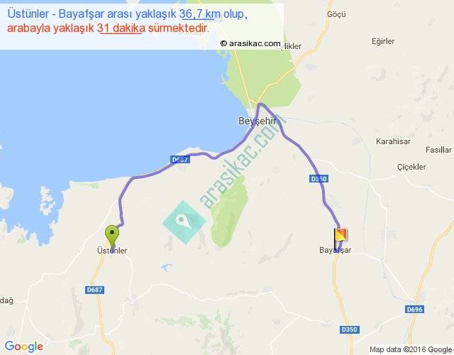 Üstünler - Bayafşar arası yaklaşık olarak 90 km/h ile yukarıda belirtilen sürede olup, iki yerin kuş uçuşu uzaklığı (mesafesi) 19'dir. Yolculuk otobüsle 40 dakika sürmektedir.