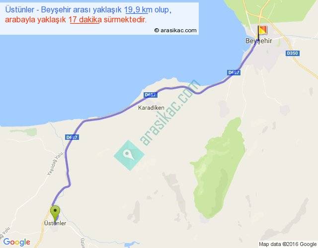Üstünler - Beyşehir arası yaklaşık olarak 90 km/h ile yukarıda belirtilen sürede olup, iki yerin kuş uçuşu uzaklığı (mesafesi) 17'dir. Yolculuk otobüsle 22 dakika sürmektedir.