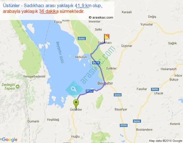 Üstünler - Sadıkhacı arası yaklaşık olarak 90 km/h ile yukarıda belirtilen sürede olup, iki yerin kuş uçuşu uzaklığı (mesafesi) 31'dir. Yolculuk otobüsle 46 dakika sürmektedir.