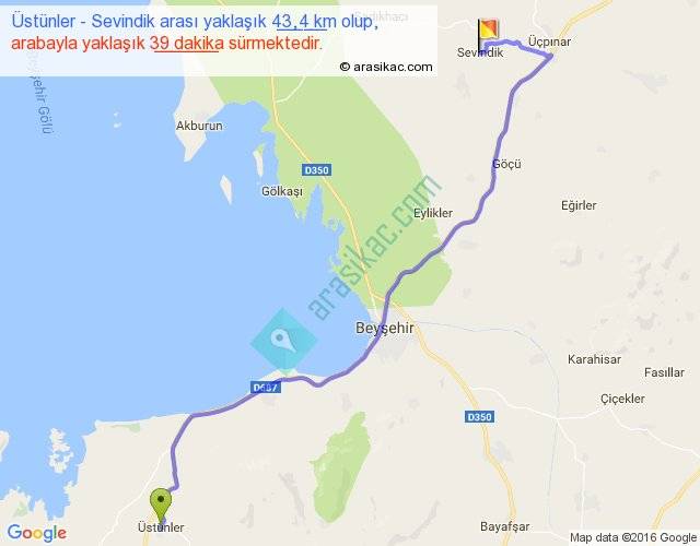Üstünler - Sevindik arası yaklaşık olarak 90 km/h ile yukarıda belirtilen sürede olup, iki yerin kuş uçuşu uzaklığı (mesafesi) 31'dir. Yolculuk otobüsle 50 dakika sürmektedir.