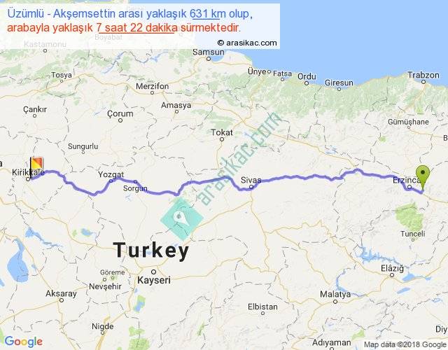 Üzümlü - Akşemsettin arası yaklaşık olarak 90 km/h ile yukarıda belirtilen sürede olup, iki yerin kuş uçuşu uzaklığı (mesafesi) 522'dir. Eğer belirtilen yerler arasında uçak seferi var ise bu süre uçakla 48 dakika'ya kadar düşebilir. Yolculuk otobüsle 9 saat 34 dakika sürmektedir.