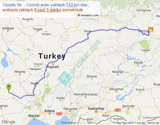 Üzümlü Sk. - Üzümlü arası yaklaşık olarak 90 km/h ile yukarıda belirtilen sürede olup, iki yerin kuş uçuşu uzaklığı (mesafesi) 574'dir. Eğer belirtilen yerler arasında uçak seferi var ise bu süre uçakla 52 dakika'ya kadar düşebilir. Yolculuk otobüsle 10 saat 30 dakika sürmektedir.