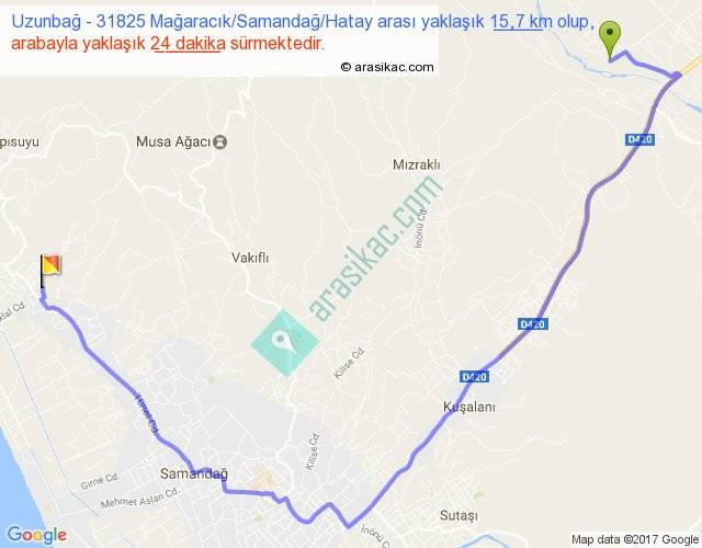 Uzunbağ - 31825 Mağaracık Samandağ Hatay arası yaklaşık olarak 90 km/h ile yukarıda belirtilen sürede olup, iki yerin kuş uçuşu uzaklığı (mesafesi) 9'dir. Yolculuk otobüsle 31 dakika sürmektedir.