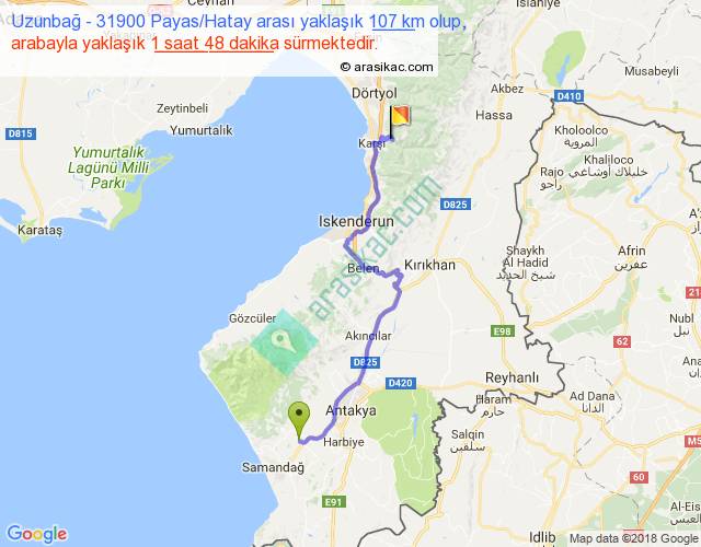 Uzunbağ - 31900 Payas Hatay arası yaklaşık olarak 90 km/h ile yukarıda belirtilen sürede olup, iki yerin kuş uçuşu uzaklığı (mesafesi) 71'dir. Yolculuk otobüsle 2 saat 20 dakika sürmektedir.