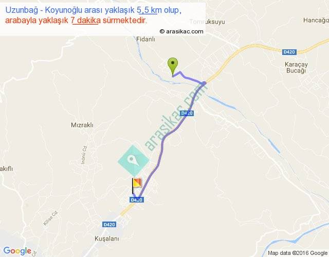 Uzunbağ - Koyunoğlu arası yaklaşık olarak 90 km/h ile yukarıda belirtilen sürede olup, iki yerin kuş uçuşu uzaklığı (mesafesi) 4'dir. Yolculuk otobüsle 9 dakika sürmektedir.