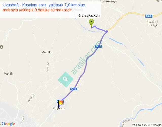 Uzunbağ - Kuşalanı arası yaklaşık olarak 90 km/h ile yukarıda belirtilen sürede olup, iki yerin kuş uçuşu uzaklığı (mesafesi) 5'dir. Yolculuk otobüsle 11 dakika sürmektedir.
