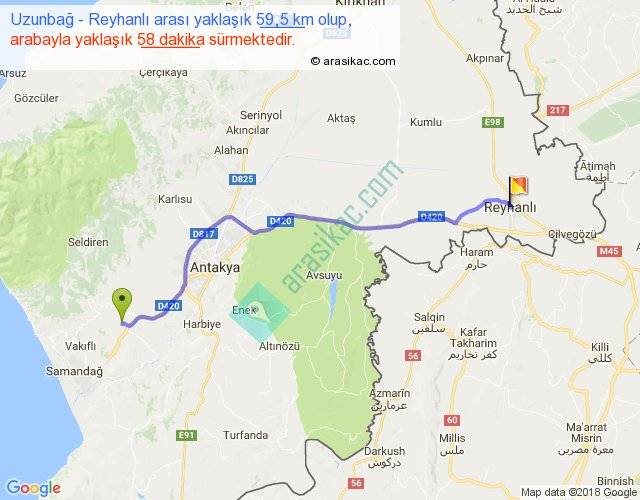 Uzunbağ - Reyhanlı arası yaklaşık olarak 90 km/h ile yukarıda belirtilen sürede olup, iki yerin kuş uçuşu uzaklığı (mesafesi) 50'dir. Yolculuk otobüsle 1 saat 15 dakika sürmektedir.
