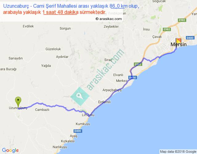 Uzuncaburç - Cami Şerif Mahallesi arası yaklaşık olarak 90 km/h ile yukarıda belirtilen sürede olup, iki yerin kuş uçuşu uzaklığı (mesafesi) 67'dir. Yolculuk otobüsle 2 saat 20 dakika sürmektedir.
