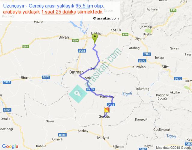Uzunçayır - Gercüş arası yaklaşık olarak 90 km/h ile yukarıda belirtilen sürede olup, iki yerin kuş uçuşu uzaklığı (mesafesi) 58'dir. Yolculuk otobüsle 1 saat 50 dakika sürmektedir.