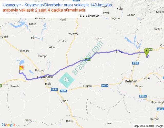 Uzunçayır - Kayapınar Diyarbakır arası yaklaşık olarak 90 km/h ile yukarıda belirtilen sürede olup, iki yerin kuş uçuşu uzaklığı (mesafesi) 120'dir. Yolculuk otobüsle 2 saat 41 dakika sürmektedir.