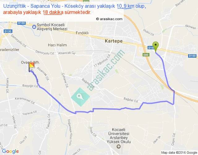 Uzunçiftlik - Sapanca Yolu - Köseköy arası yaklaşık olarak 90 km/h ile yukarıda belirtilen sürede olup, iki yerin kuş uçuşu uzaklığı (mesafesi) 6'dir. Yolculuk otobüsle 23 dakika sürmektedir.