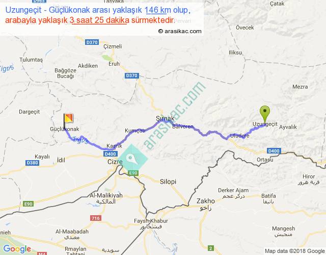Uzungeçit - Güçlükonak arası yaklaşık olarak 90 km/h ile yukarıda belirtilen sürede olup, iki yerin kuş uçuşu uzaklığı (mesafesi) 95'dir. Yolculuk otobüsle 4 saat 26 dakika sürmektedir.
