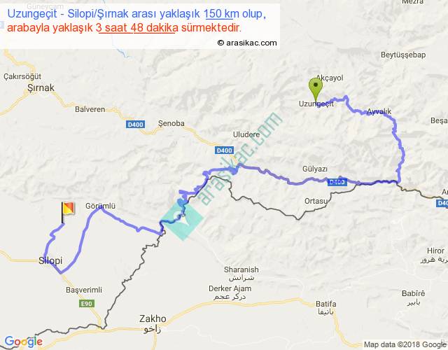 Uzungeçit - Silopi Şırnak arası yaklaşık olarak 90 km/h ile yukarıda belirtilen sürede olup, iki yerin kuş uçuşu uzaklığı (mesafesi) 48'dir. Yolculuk otobüsle 4 saat 56 dakika sürmektedir.