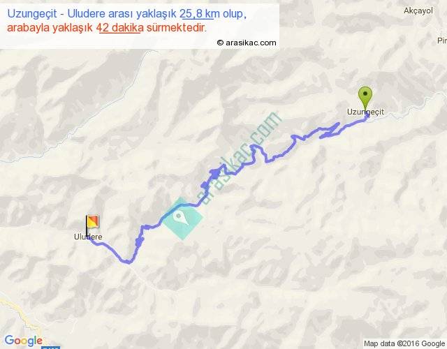 Uzungeçit - Uludere arası yaklaşık olarak 90 km/h ile yukarıda belirtilen sürede olup, iki yerin kuş uçuşu uzaklığı (mesafesi) 13'dir. Yolculuk otobüsle 54 dakika sürmektedir.