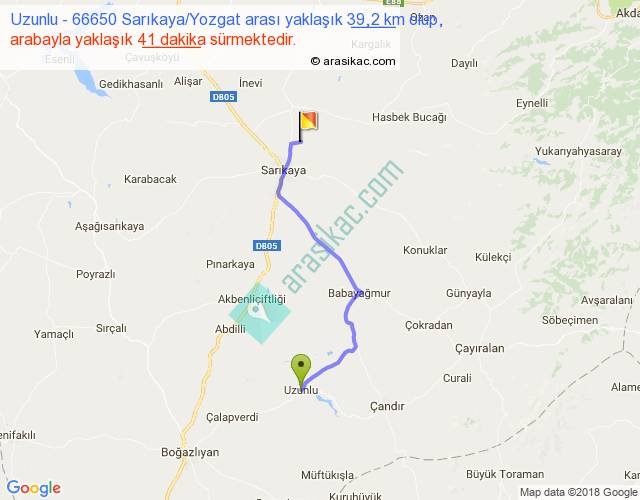 Uzunlu - 66650 Sarıkaya Yozgat arası yaklaşık olarak 90 km/h ile yukarıda belirtilen sürede olup, iki yerin kuş uçuşu uzaklığı (mesafesi) 29'dir. Yolculuk otobüsle 53 dakika sürmektedir.