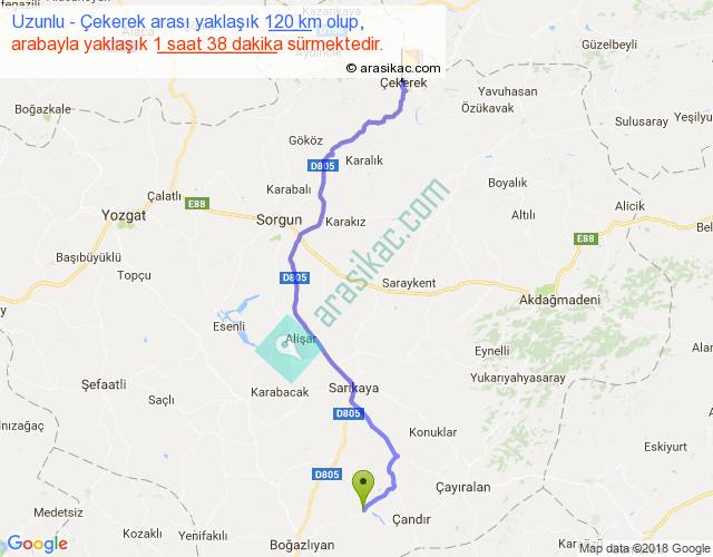 Uzunlu - Çekerek arası yaklaşık olarak 90 km/h ile yukarıda belirtilen sürede olup, iki yerin kuş uçuşu uzaklığı (mesafesi) 90'dir. Yolculuk otobüsle 2 saat 7 dakika sürmektedir.