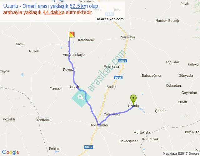 Uzunlu - Ömerli arası yaklaşık olarak 90 km/h ile yukarıda belirtilen sürede olup, iki yerin kuş uçuşu uzaklığı (mesafesi) 34'dir. Yolculuk otobüsle 57 dakika sürmektedir.