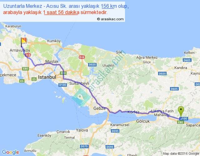 Uzuntarla Merkez - Acısu Sk. arası yaklaşık olarak 90 km/h ile yukarıda belirtilen sürede olup, iki yerin kuş uçuşu uzaklığı (mesafesi) 128'dir. Yolculuk otobüsle 2 saat 30 dakika sürmektedir.