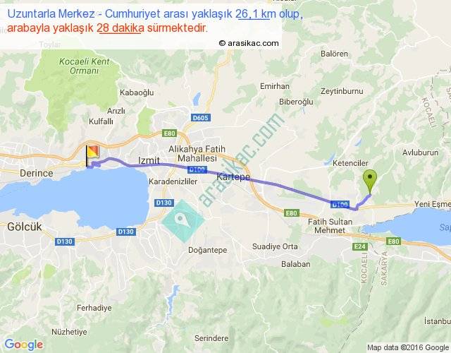 Uzuntarla Merkez - Cumhuriyet arası yaklaşık olarak 90 km/h ile yukarıda belirtilen sürede olup, iki yerin kuş uçuşu uzaklığı (mesafesi) 23'dir. Yolculuk otobüsle 36 dakika sürmektedir.