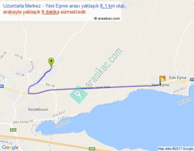 Uzuntarla Merkez - Yeni Eşme arası yaklaşık olarak 90 km/h ile yukarıda belirtilen sürede olup, iki yerin kuş uçuşu uzaklığı (mesafesi) 5'dir. Yolculuk otobüsle 10 dakika sürmektedir.