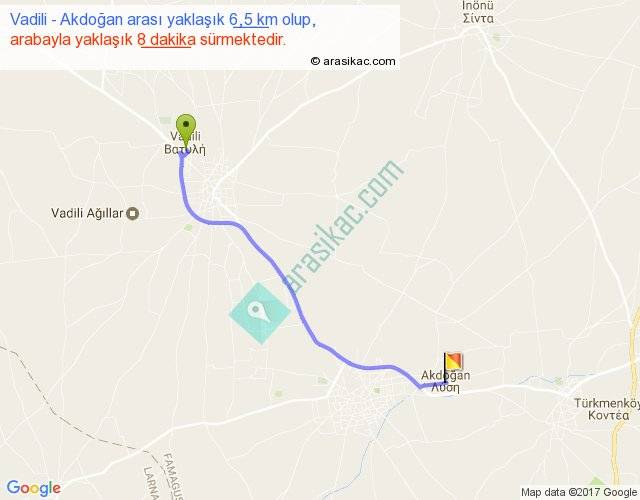 Vadili - Akdoğan arası yaklaşık olarak 90 km/h ile yukarıda belirtilen sürede olup, iki yerin kuş uçuşu uzaklığı (mesafesi) 5'dir. Yolculuk otobüsle 10 dakika sürmektedir.