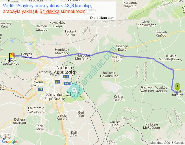 Vadili - Alayköy arası yaklaşık olarak 90 km/h ile yukarıda belirtilen sürede olup, iki yerin kuş uçuşu uzaklığı (mesafesi) 37'dir. Yolculuk otobüsle 1 saat 10 dakika sürmektedir.
