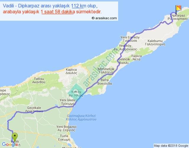 Vadili - Dipkarpaz arası yaklaşık olarak 90 km/h ile yukarıda belirtilen sürede olup, iki yerin kuş uçuşu uzaklığı (mesafesi) 87'dir. Yolculuk otobüsle 2 saat 33 dakika sürmektedir.