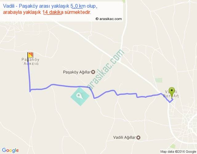 Vadili - Paşaköy arası yaklaşık olarak 90 km/h ile yukarıda belirtilen sürede olup, iki yerin kuş uçuşu uzaklığı (mesafesi) 4'dir. Yolculuk otobüsle 18 dakika sürmektedir.