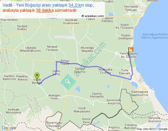 Vadili - Yeni Boğaziçi arası yaklaşık olarak 90 km/h ile yukarıda belirtilen sürede olup, iki yerin kuş uçuşu uzaklığı (mesafesi) 23'dir. Yolculuk otobüsle 49 dakika sürmektedir.