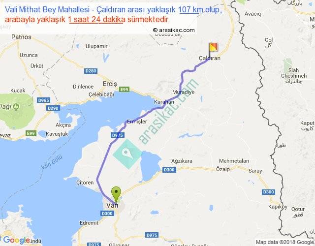 Vali Mithat Bey Mahallesi - Çaldıran arası yaklaşık olarak 90 km/h ile yukarıda belirtilen sürede olup, iki yerin kuş uçuşu uzaklığı (mesafesi) 83'dir. Yolculuk otobüsle 1 saat 49 dakika sürmektedir.