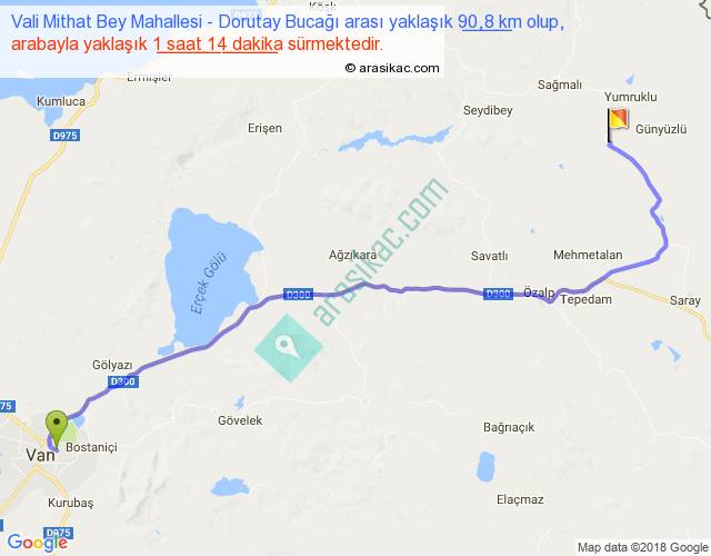 Vali Mithat Bey Mahallesi - Dorutay Bucağı arası yaklaşık olarak 90 km/h ile yukarıda belirtilen sürede olup, iki yerin kuş uçuşu uzaklığı (mesafesi) 68'dir. Yolculuk otobüsle 1 saat 36 dakika sürmektedir.