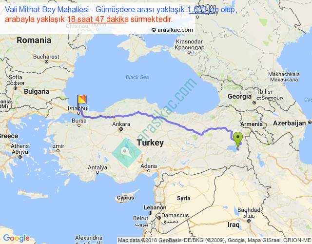 Vali Mithat Bey Mahallesi - Gümüşdere arası yaklaşık olarak 90 km/h ile yukarıda belirtilen sürede olup, iki yerin kuş uçuşu uzaklığı (mesafesi) 1258'dir. Eğer belirtilen yerler arasında uçak seferi var ise bu süre uçakla 1 saat 56 dakika'ya kadar düşebilir. Yolculuk otobüsle 1 gün 0 saat sürmektedir.