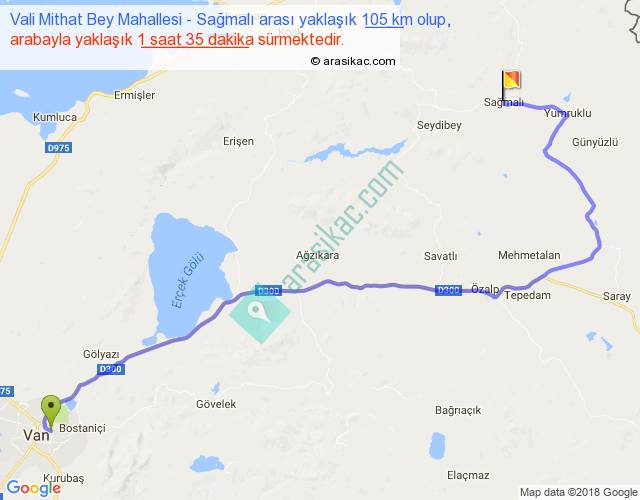 Vali Mithat Bey Mahallesi - Sağmalı arası yaklaşık olarak 90 km/h ile yukarıda belirtilen sürede olup, iki yerin kuş uçuşu uzaklığı (mesafesi) 66'dir. Yolculuk otobüsle 2 saat 3 dakika sürmektedir.
