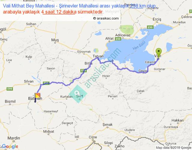 Vali Mithat Bey Mahallesi - Şirinevler Mahallesi arası yaklaşık olarak 90 km/h ile yukarıda belirtilen sürede olup, iki yerin kuş uçuşu uzaklığı (mesafesi) 208'dir. Yolculuk otobüsle 5 saat 27 dakika sürmektedir.