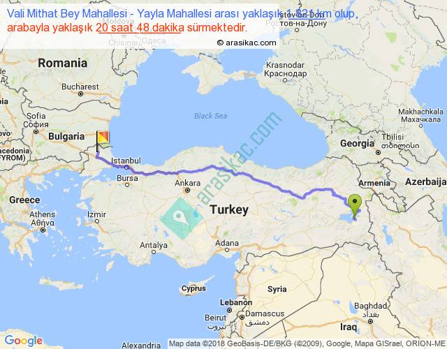 Vali Mithat Bey Mahallesi - Yayla Mahallesi arası yaklaşık olarak 90 km/h ile yukarıda belirtilen sürede olup, iki yerin kuş uçuşu uzaklığı (mesafesi) 1411'dir. Eğer belirtilen yerler arasında uçak seferi var ise bu süre uçakla 2 saat 10 dakika'ya kadar düşebilir. Yolculuk otobüsle 1 gün 3 saat sürmektedir.
