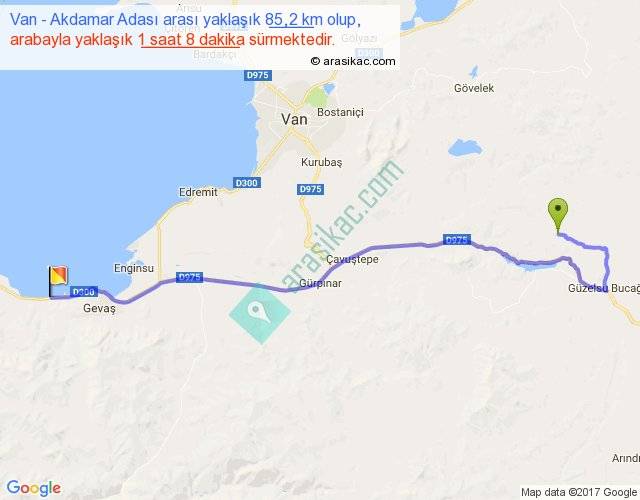 Van - Akdamar Adası arası yaklaşık olarak 90 km/h ile yukarıda belirtilen sürede olup, iki yerin kuş uçuşu uzaklığı (mesafesi) 61'dir. Yolculuk otobüsle 1 saat 28 dakika sürmektedir.