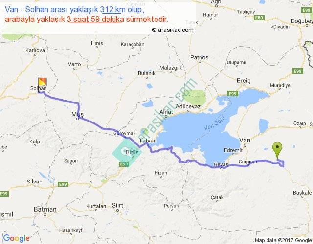 Van - Solhan arası yaklaşık olarak 90 km/h ile yukarıda belirtilen sürede olup, iki yerin kuş uçuşu uzaklığı (mesafesi) 240'dir. Yolculuk otobüsle 5 saat 10 dakika sürmektedir.