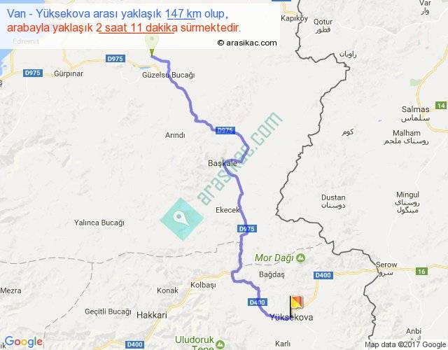 Van - Yüksekova arası yaklaşık olarak 90 km/h ile yukarıda belirtilen sürede olup, iki yerin kuş uçuşu uzaklığı (mesafesi) 130'dir. Yolculuk otobüsle 3 saat 22 dakika sürmektedir.