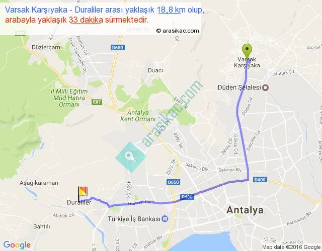 Varsak Karşıyaka - Duraliler arası yaklaşık olarak 90 km/h ile yukarıda belirtilen sürede olup, iki yerin kuş uçuşu uzaklığı (mesafesi) 13'dir. Yolculuk otobüsle 42 dakika sürmektedir.