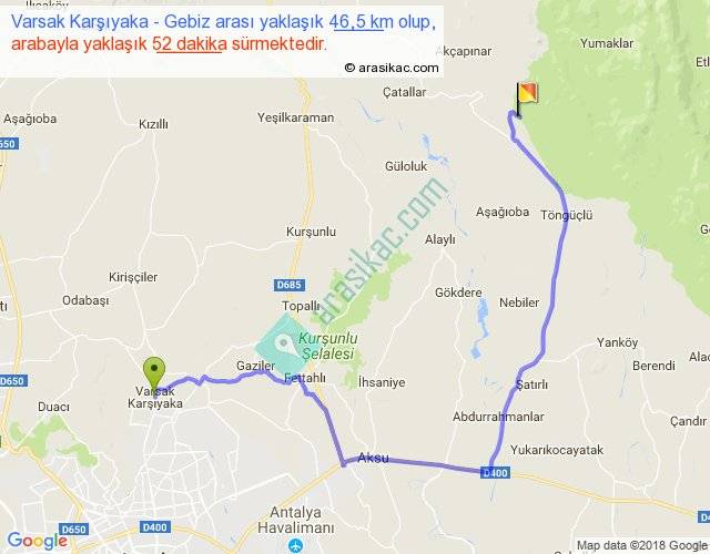 Varsak Karşıyaka - Gebiz arası yaklaşık olarak 90 km/h ile yukarıda belirtilen sürede olup, iki yerin kuş uçuşu uzaklığı (mesafesi) 25'dir. Yolculuk otobüsle 1 saat 7 dakika sürmektedir.