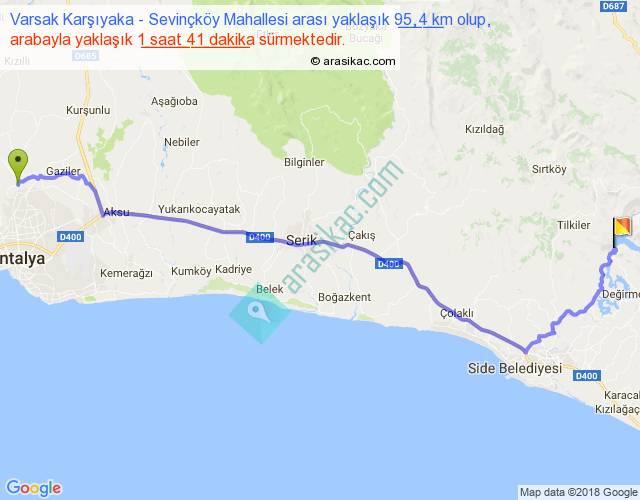 Varsak Karşıyaka - Sevinçköy Mahallesi arası yaklaşık olarak 90 km/h ile yukarıda belirtilen sürede olup, iki yerin kuş uçuşu uzaklığı (mesafesi) 73'dir. Yolculuk otobüsle 2 saat 11 dakika sürmektedir.