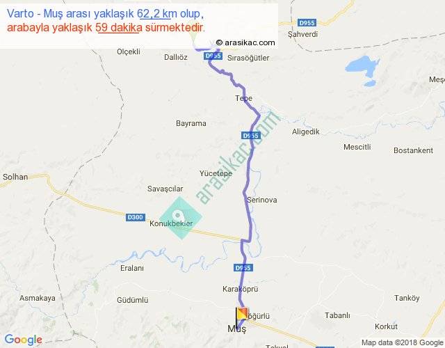 Varto - Muş arası yaklaşık olarak 90 km/h ile yukarıda belirtilen sürede olup, iki yerin kuş uçuşu uzaklığı (mesafesi) 49'dir. Yolculuk otobüsle 1 saat 7 dakika sürmektedir.