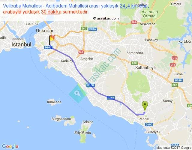 Velibaba Mahallesi - Acıbadem Mahallesi arası yaklaşık olarak 90 km/h ile yukarıda belirtilen sürede olup, iki yerin kuş uçuşu uzaklığı (mesafesi) 22'dir. Yolculuk otobüsle 39 dakika sürmektedir.