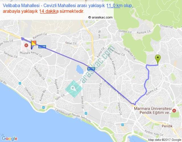 Velibaba Mahallesi - Cevizli Mahallesi arası yaklaşık olarak 90 km/h ile yukarıda belirtilen sürede olup, iki yerin kuş uçuşu uzaklığı (mesafesi) 6'dir. Yolculuk otobüsle 18 dakika sürmektedir.